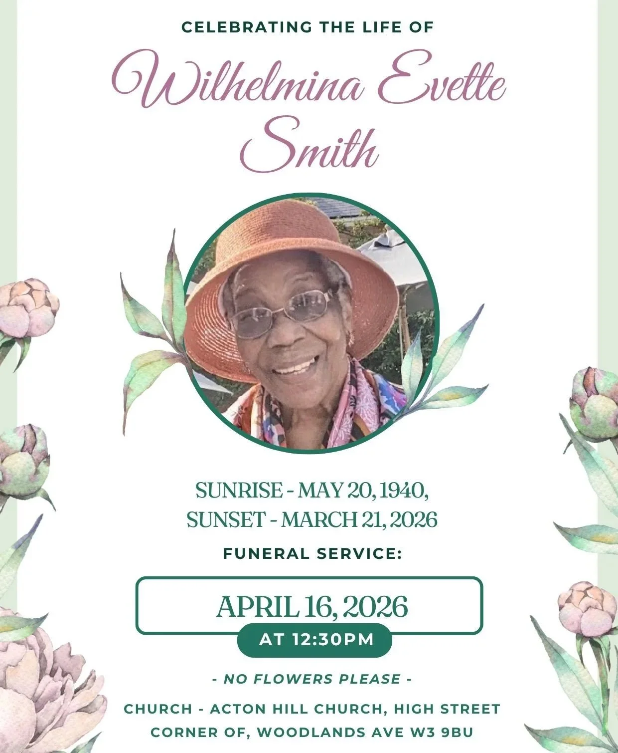 Wilhelmina Evette SmithWatch live on 16th April 2026 from 12:15pm CLICK HERE TO WATCH PRIVATELY ON YOUTUBE Wilhelmina Evette Smith Click here for the Order of Service